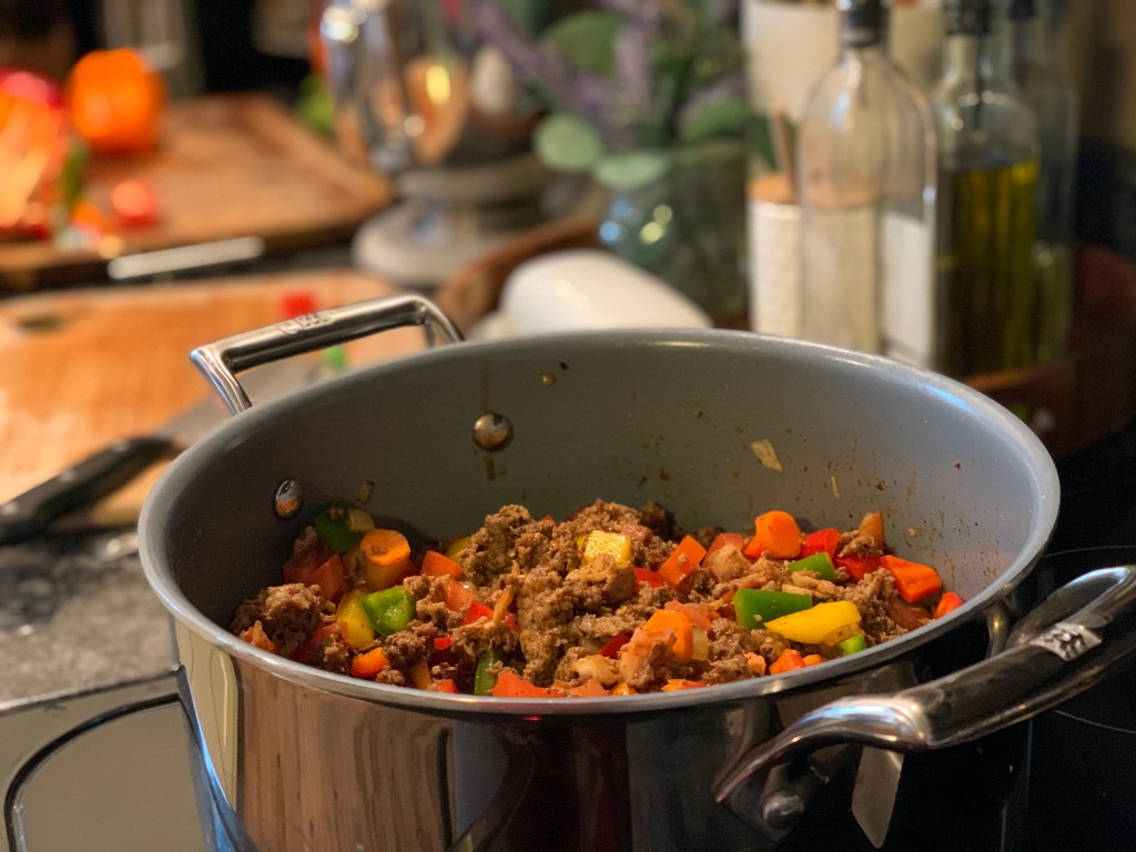 This may not seem like your traditional chili at all but I promise, as it cooks down, it transforms into a tasty, hearty chili!